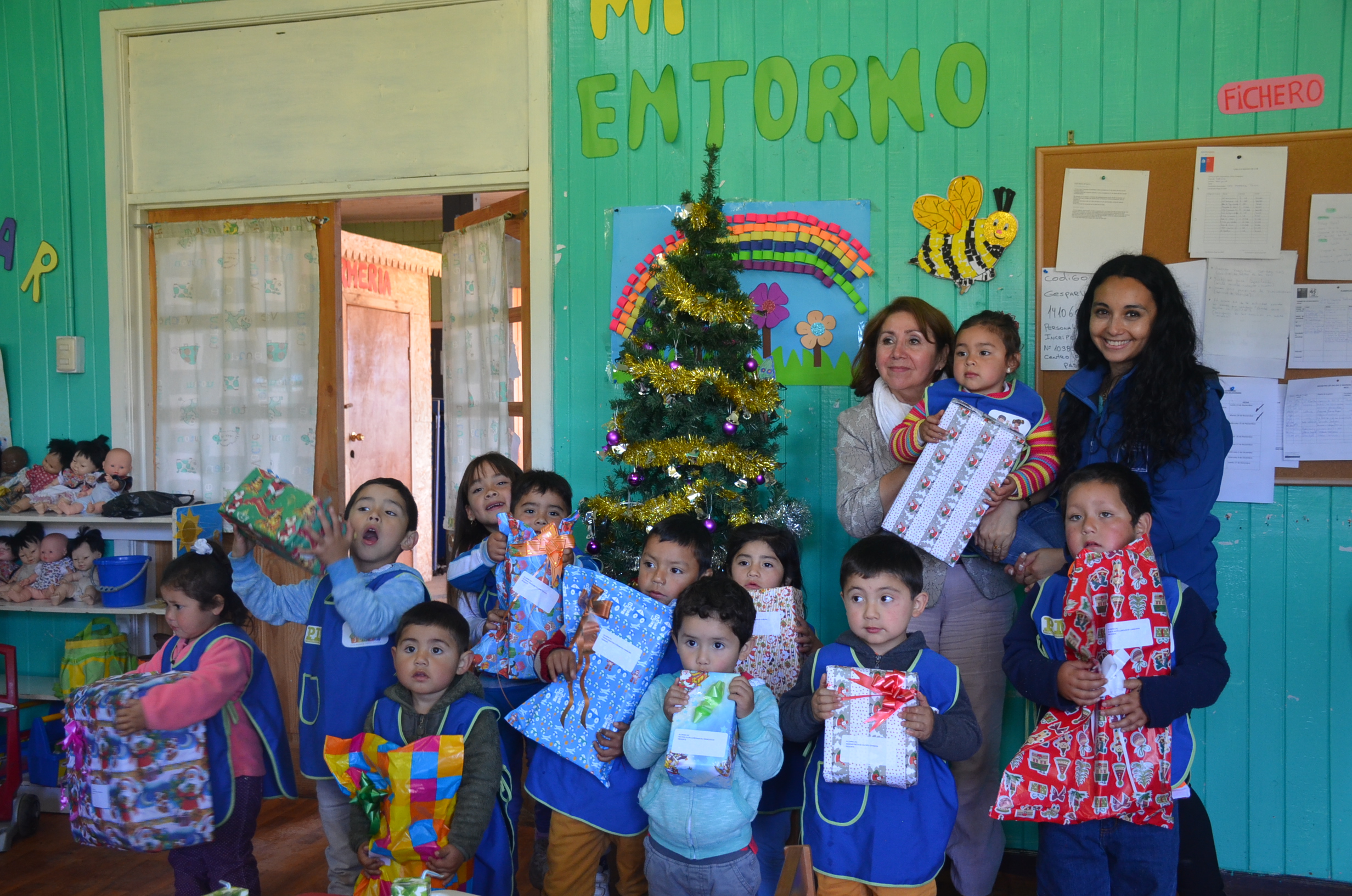 Niños y niñas de la escuela rural de Dollinco que son parte del Programa de Mejoramiento a la Infancia de Junji, recibieron esta mañana la visita de la Seremi de Educación Erna Guerra, quien en representación de los funcionarios de Secreduc Los Ríos visitó el establecimiento con el objetivo de hacer entrega de diversos presentes navideños a los pequeños.